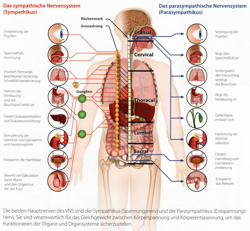 Das VNS oder auch autonomes Nervensystem ist die oberste Steuerzentrale im Körper. Es steuert und reguliert alle lebenswichtige Organe und Organsysteme, die willentlich nicht zu beeinflussen sind, wie. z. B. das Herz, die Atmung, den Blutdruck, den Stoffwechsel, die Durchblutung, Sinnesorgane, Geschlechtsorgane usw.